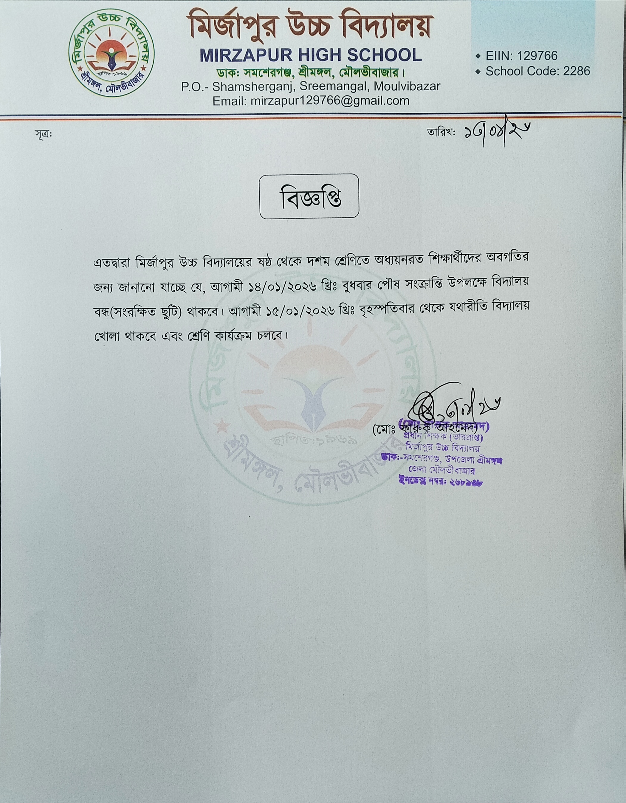 | ১ | পৌষ সংক্রান্তি উপলক্ষে বিদ্যালয় ছুটি সংক্রান্ত বিজ্ঞপ্তি | ২০২৬-০১-১৩ |